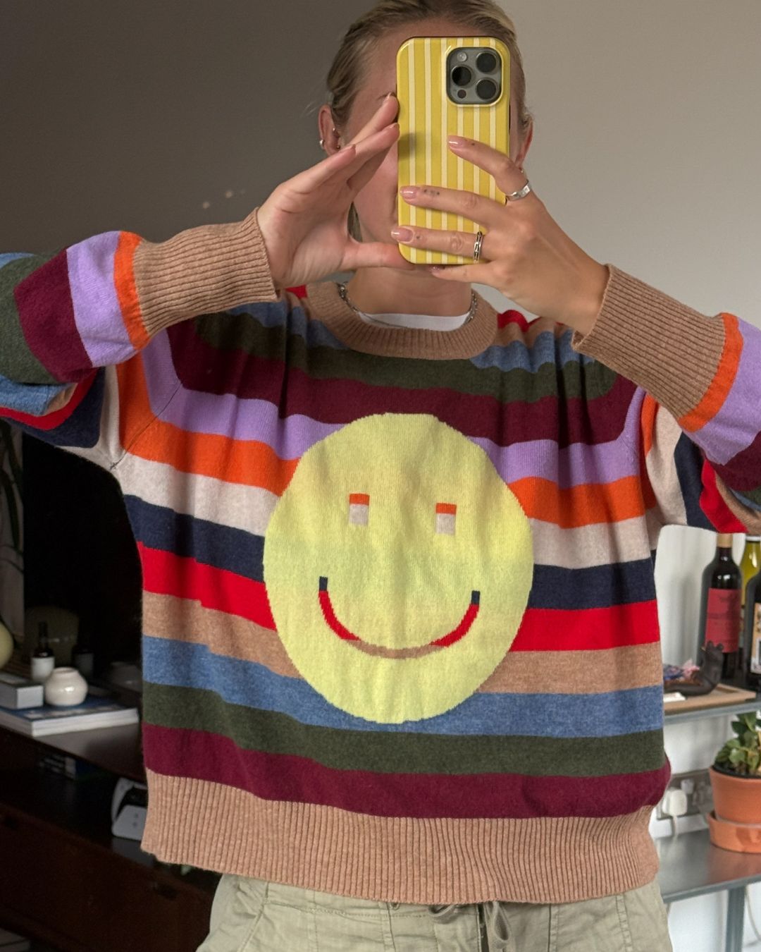 Rainbow stripe very oversized sweater with smile face on the body. This is a lighter weight version of the piece that became the on site style which is a heavier weight.